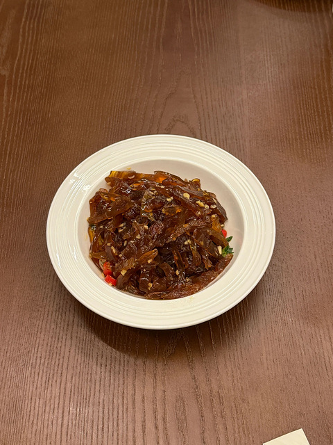 意外吃到的一家台州菜馆子,非常符合本人以及周围一圈浙江人的口味 ¥48·凉拌海蜇好吃,酸甜口的,下面垫了黄瓜,很开胃。 ¥38·家烧笋衣本人很爱吃这个笋干,但是他这个里面加了姜汁,吃起来一股姜味,不是很喜欢。但是介于喜欢笋干本人,还是打包吃完了。 ¥68·秘制红烧肉不明白为什么要在台州菜馆点红烧肉,但照做。一看卖相就是好红烧肉,瘦肉酥,肥肉软,猪皮带着一丝丝韧,很下饭。 ¥58·雪菜枪鱿鱼很鲜很香
