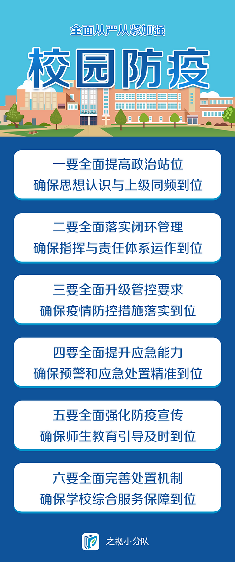 12月13日,浙江省教育厅下发关于全面从严从紧加强校园疫情防控工作的通知,要求各市各高等学校,要全面从严从紧加强校园疫情防控工作。 【划重点】 【一起来看具体内容】 一要全面提高政治站位,确保思想认识与上级同频到位。要清醒认识当前疫情防控形势的严峻性复杂性,坚决克服任何麻痹思想、厌战情绪、侥幸心理、松劲心态,按照“严密防范、果断处置、科学精准”疫情防控总基调,从严从紧加强校园疫情防控工作,坚决扛起