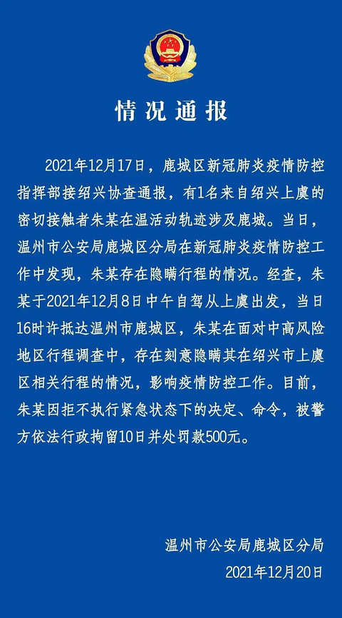 刻意隐瞒行程!浙江1名密接者 被行拘10日