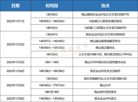 1月6日16时,瑞安市疾控中心接宁波市疾控中心确诊病例密切接触者的协查函,该密接者朱某某12月31日乘坐高铁G7539(5车10A)返瑞。瑞安市接到协查函后立即对其进行相关活动轨迹等流调排查,现将该密接者在瑞安市活动轨迹公布如下: 请在上述时间、地点与该密接者有接触或轨迹交叉的人员,第一时间主动向属地乡镇、社区(村)报告;在做好个人防护的情况下,就近接受核酸检测;配合做好流调和管理工作,如瞒报、迟
