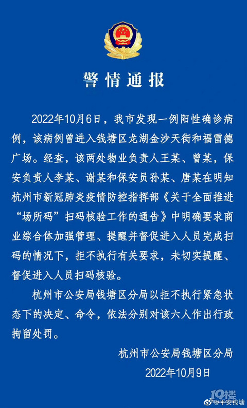 杭州两商场未落实进入人员扫码核验,6人被行政拘留