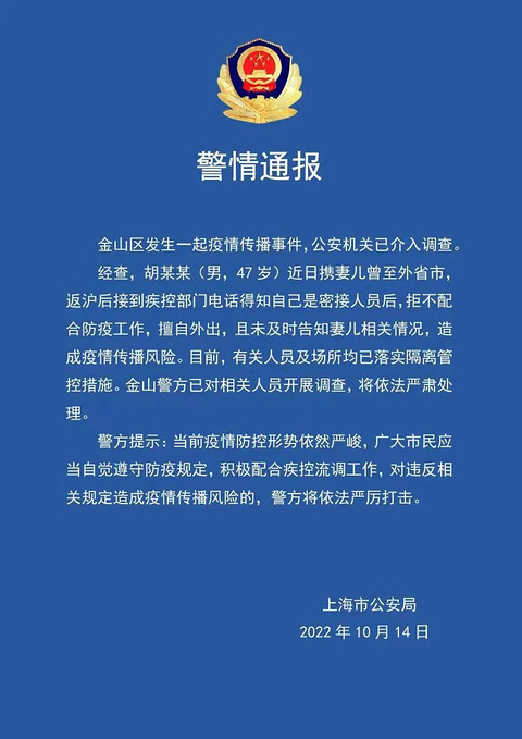 今天上海警方通报,金山区发生一起疫情传播事件,公安机关已介入调查。 经查,胡某某(男,47岁)近日携妻儿曾至外省市,返沪后接到疾控部门电话得知自己是密接人员后,拒不配合防疫工作,擅自外出,且未及时告知妻儿相关情况,造成疫情传播风险。 目前,有关人员及场所均已落实隔离管控措施。金山警方已对相关人员开展调查,将依法严肃处理。 警方提示:当前疫情防控形势依然严峻,广大市民应当自觉遵守防疫规定,积极配合疾