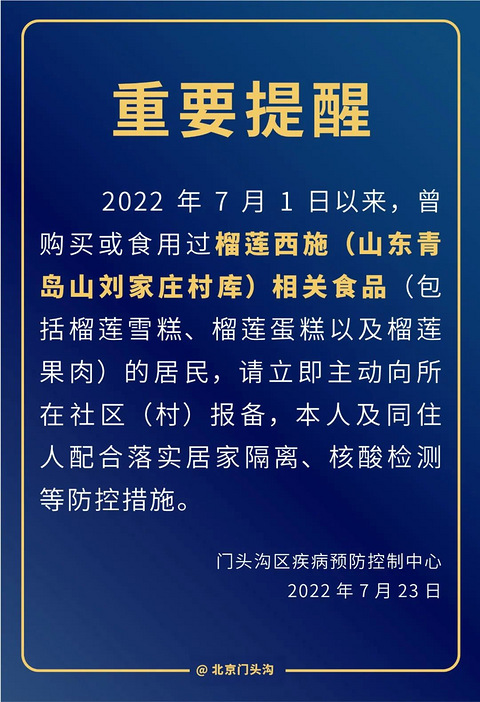 北京: 7月1日来,购买过这些食品的人,请主动报备7月23日下午,北京昌平、房山、石景山、海淀、门头沟、密云多区均发布提醒:7月1日以来,曾购买过榴莲西施(山东青岛山刘家庄村库)相关食品(包括榴莲雪糕、榴莲蛋糕以及榴莲果肉)的居民,请主动向社区(村)报备,本人及同住人配合村(居)委会落实居家隔离、核酸检测等防控措施。 昌平区 房山区 石景山区 海淀区 门头沟 密云区 查询该品牌电商平台介绍发现,该