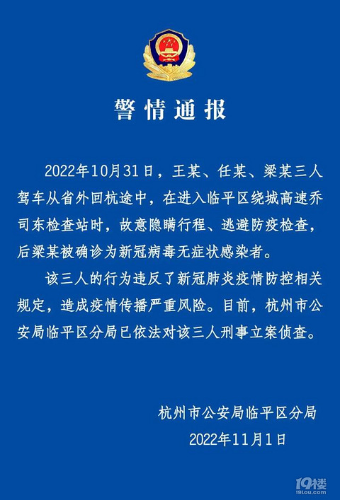 三人驾车从省外回杭途中,故意隐瞒行程,已被刑事立案侦查