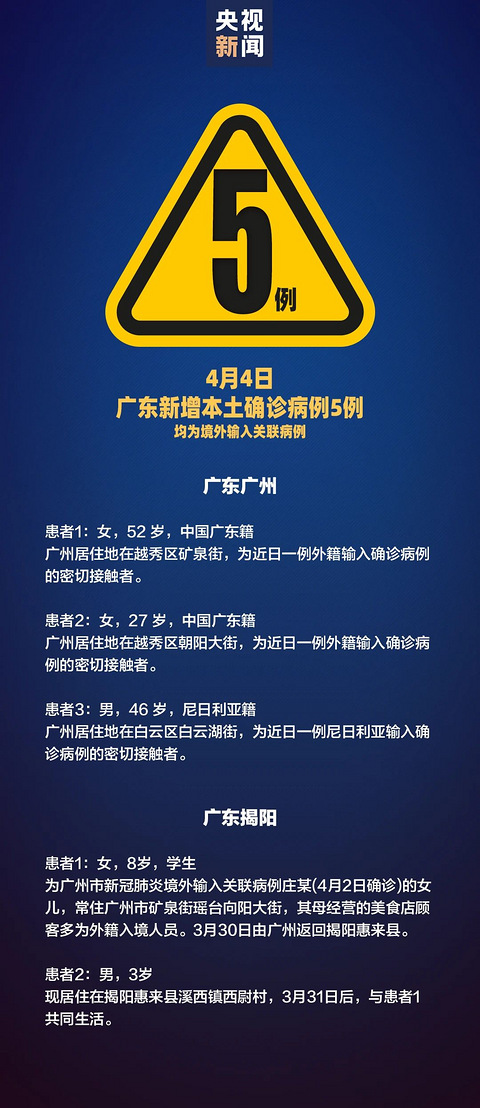 据国家卫健委4月5日通报,4月4日0-24时,31个省(自治区、直辖市)和新疆生产建设兵团报告新增确诊病例30例,其中25例为境外输入病例,5例为本土病例(广东5例)。另据广东省卫健委4月5日通报,4月4日0-24时,广东省新增境外输入确诊病例3例,分别为广州报告2例(美国、加拿大输入各1例)、深圳报告1例(美国输入)。广州报告3例,揭阳报告2例境外输入关联病例。广州新增3例境外输入关联病例有关