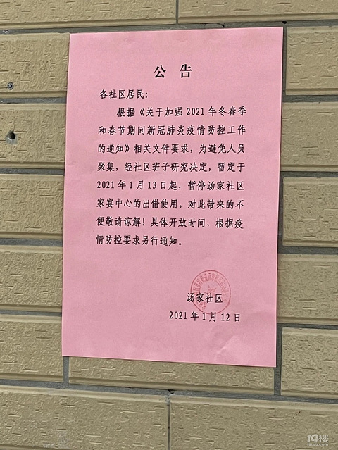 杭州一社区紧急通知:暂停!2021年1月13日@钱江晚报:马上要过年了,按照往年的惯例,大家准备摆年酒了结婚、满月、周岁的喜宴也要安排了余杭有社区下发通知:1月13日起暂停家宴中心借出使用!昨天,星桥街道汤家社区下发通知:1月13日起暂停家宴中心借出使用!在汤家社区家宴中心的门口,记者发现了张贴出的公告。↓↓↓同时,家宴中心的宴会厅和厨房门口,都已经贴上了带有汤家社区