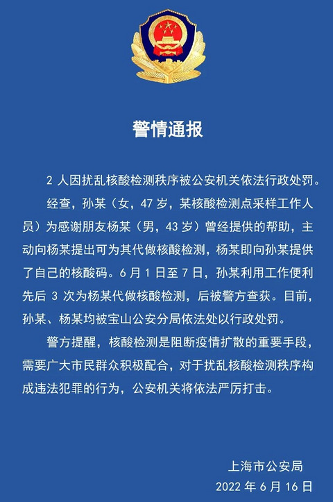 6月16日上海警方发布通报:2人因扰乱核酸检测秩序被公安机关依法行政处罚↓↓ 经查,孙某(女,47岁,某核酸检测点采样工作人员)为感谢朋友杨某(男,43岁)曾经提供的帮助,主动向杨某提出可为其代做核酸检测,杨某即向孙某提供了自己的核酸码。6月1日至7日,孙某利用工作便利先后3次为杨某代做核酸检测,后被警方查获。 目前,孙某、杨某均被宝山公安分局依法处以行政处罚。 此外,昨天北京日报发布一则消息↓↓