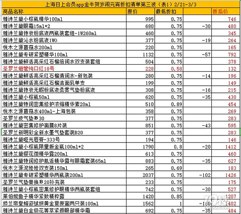 安耐晒小金瓶90Ml两支装折后331科颜氏高保湿面霜折后296红腰子100Ml*2折后1238、值得囤货科颜氏金盏花水500Ml折后278黛珂防晒90Ml折后255SK神仙水2瓶装折后1608赫莲娜绿宝瓶折后2492圣罗兰皮气垫折后282雅诗兰黛红石榴洁面149雅诗兰黛眼霜15Ml*2折后480更多折扣可以查看主图清单或者日上app、都可以日上免税行直邮到家