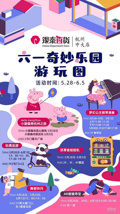 童年总会长大,童心却可以珍藏。马上就是“六一”儿童节,不少商场已准备了丰富多彩的活动,迎接小朋友们的到来。据悉,5月28日-6月5日,杭州中大银泰推出为期一周的“六一奇妙乐园”,梦幻公主钢琴演奏、AR寻宝、亲子厨房等上百场亲子互动体验活动将轮番上演。 (图:杭州中大银泰打造“六一奇妙乐园”)期间,深受小朋友喜爱的小猪佩奇也将来到杭州,不仅带来跳泥坑、爱心跳绳等经典游戏,还会带来6米高的巨型人偶,与