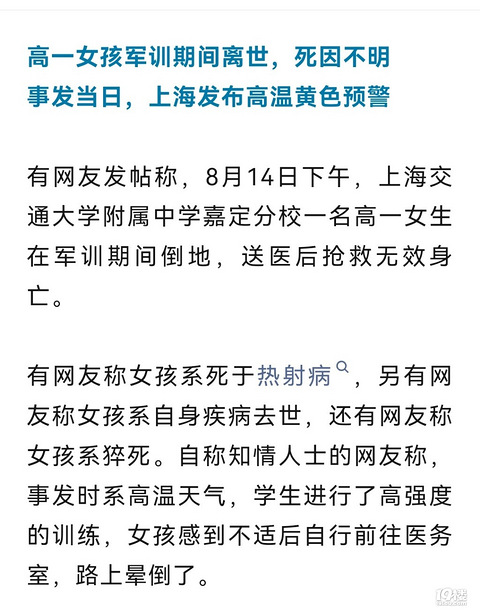 看到了一则新闻:上海女孩高温天气里参加军训,热射病死亡。 如今全球变暖温度异常,中学生不应再在夏天军训了!