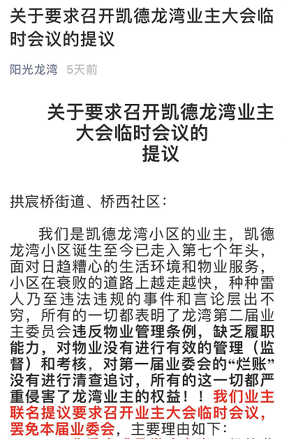 楼盘交付后,小区的管理问题是重中之重,许多高端小区都会成立业委会,为业主发声,监督物业管理。 近日,位于拱墅区小河路凯德龙湾小区业主和业委会之间却矛盾频发,业主们为了“维权”,要求成立临时业主大会,罢免本届业委会。 这到底是怎么一回事呢? 杭州凯德龙湾小区 网图 上周五,阳光龙湾公开发表《关于要求召开凯德龙湾业主大会临时会议的提议》声明,矛盾直指业委会。 声明指出,龙湾第二届业主委员会违反物业管
