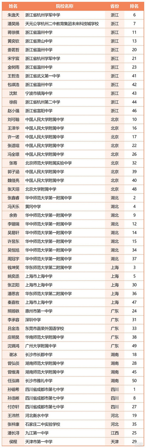 从表格可以看出:1、浙江好强啊,12位同学进入国家集训队,占比近四分之一。2、浙江的得奖地区和学校比较分散,特别突出的是温州中学3、湖北华中师范第一附属中学这一所学校就贡献了7位国家集训队队员,厉害4、江苏,山东教育大省无人入选