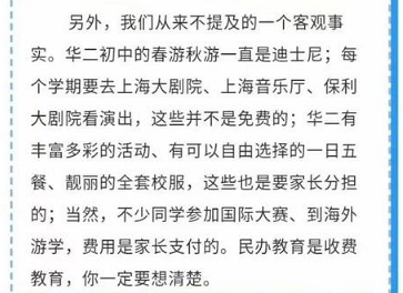 不知道大家有没有看到上海华二初中前几天发的一个推文,文章里面直接跟大家表达的意思就是:没有能力、没有实力的,就别考虑我们学校了。虽然文章迫于压力,发表两个小时就被删了,不过有手快的网友保存了,来跟大家分享一下。 反复询问家长:你真的想好了吗? “学校没变,老师没变,课程没变,理念没变...”,意思是学生要变了 迪士尼、上海大剧院、上海音乐厅...“这些并不是免费的”,“民办教育是收费教育”意思就是
