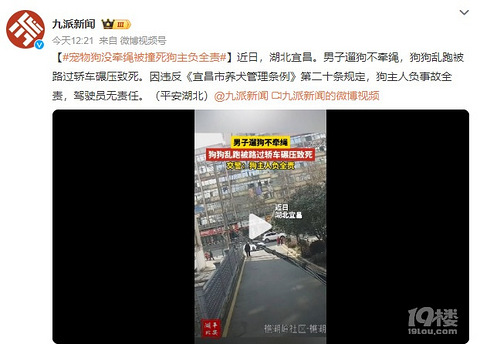 九派新闻 今天12:21 来自 微博视频号 近日,湖北宜昌。男子遛狗不牵绳,狗狗乱跑被路过轿车碾压致死。因违反《宜昌市养犬管理条例》第二十条规定,狗主人负事故全责,驾驶员无责任。(平安湖北)