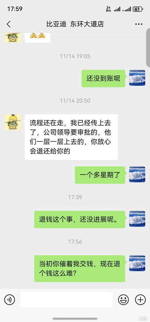 我于2025年10月31日去了比亚迪东环大道店,当时觉得某一款车挺合适的,销售也对我做了介绍。当时我明确表示今天只是过来看看,至于买最终怎么做选择,我还要对比一下其他品牌的车,然后就离开了4S店。 没多久,该销售就给我打来电话,问我对比的怎么样?我也表示,现在还没做出选择,该销售用各种条件催促我缴纳意向金,并且电话和