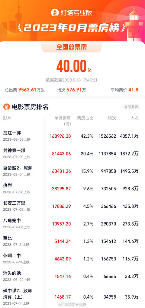 根据灯塔专业版数据,截至8月13日17时46分,2023年8月总票房(含预售)突破40亿元。电影《孤注一掷》以16.8亿元的月票房成绩领跑,《封神第一部》《巨齿鲨2:深渊》暂列第二、三位。 由申奥执导、张艺兴、金晨、王传君等主演的反诈题材电影《孤注一掷》话题度持续走高,带动票房继续攀升。8月13日,影片上映第6天,累计票房破16亿,跻身2023内地电影票房榜第七位,观影人次突破4000万。 《封神