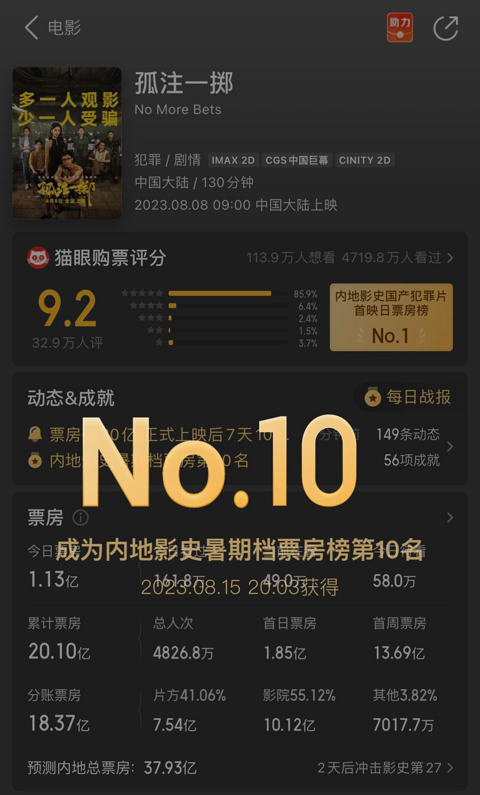 电影《孤注一掷》上映不到3天 票房突破10亿