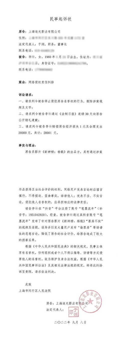 9月9日,追光动画电影《新神榜:杨戬》针对“《新神榜:杨戬》偷票房”的诽谤性言论,向造谣者正式提起诉讼。 追光动画电影《新神榜:杨戬》针对“《新神榜:杨戬》偷票房”的诽谤性言论,向造谣者正式提起诉讼,要求被告停止侵犯电影名誉权,删除相关视频及文字、公开道歉、赔偿经济损失。 来源:凤凰网娱乐