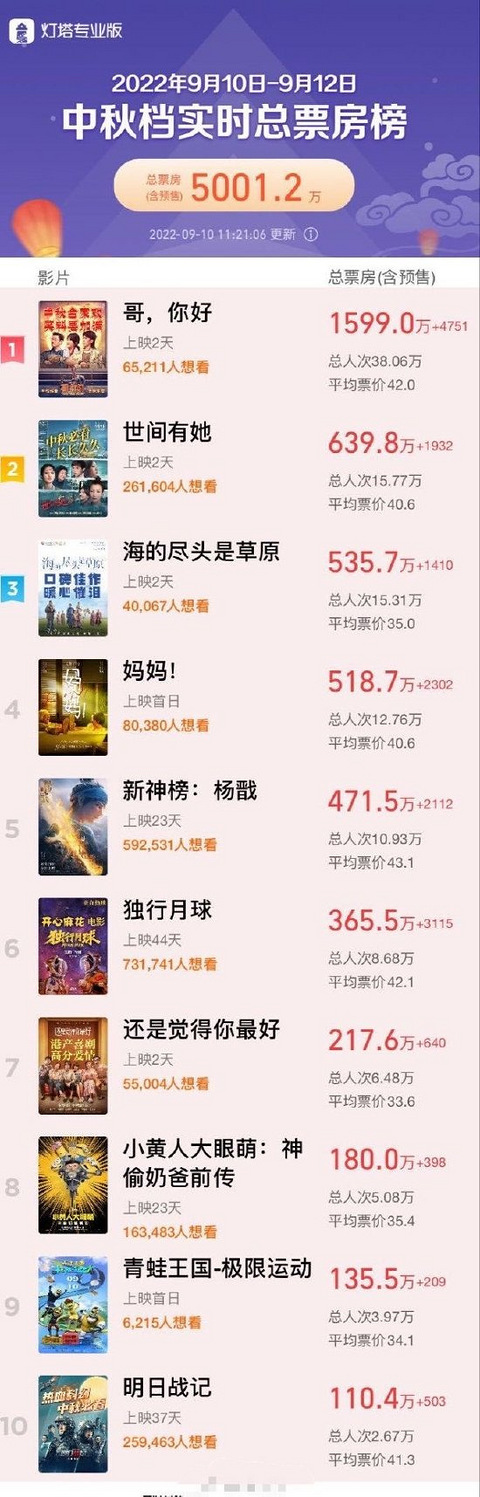 2022中秋档票房破5000万 《哥,你好》暂列第一