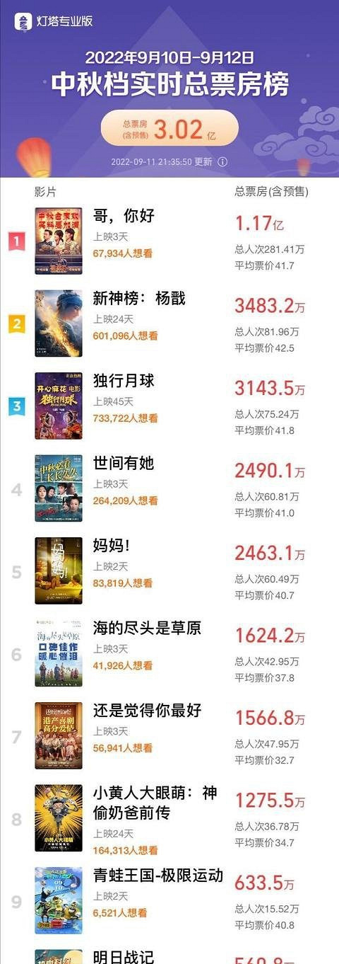 2022中秋档总票房破3亿,《哥,你好》达1.17亿